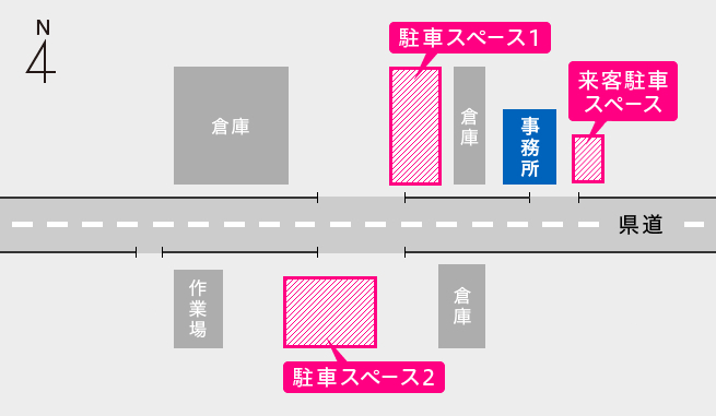 ビティ・足場板・鉄板の積込、返却の方は駐車スペース1、ネットの積込、返却の方は駐車スペース2をご利用ください。